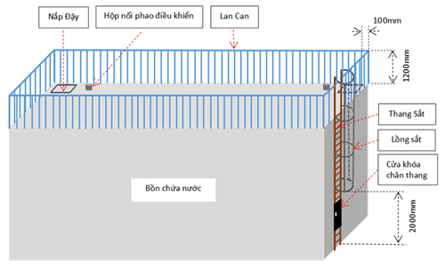 - Trong vận hành bình thường, mức nước trong bồn chứa được điều khiển tự động thông qua hệ thống phao mức nước để điều khiển chạy/dừng các bơm cấp nước và báo tín hiệu khi mực nước thấp hoặc cao tại các rơ le phụ đặt tại tủ điều khiển. Tuy nhiên, trong một số trường hợp vận hành có thể xảy ra những bất thường như hư hỏng phao, các phao bị treo, cuốn, hư hỏng tiếp điểm phao...dẫn đến việc vận hành bơm cấp nước không chính xác. Để xử lý sự cố, nhân viên vận hành phải leo lên nóc của bể chứa, tháo nắp che để kiểm tra các phao. Hoặc trong quá trình bảo dưỡng, sửa chữa định kỳ, nhân viên PXSC phải leo lên nóc Bể nước để kiểm tra, thử tín hiệu tác động của các phao này.